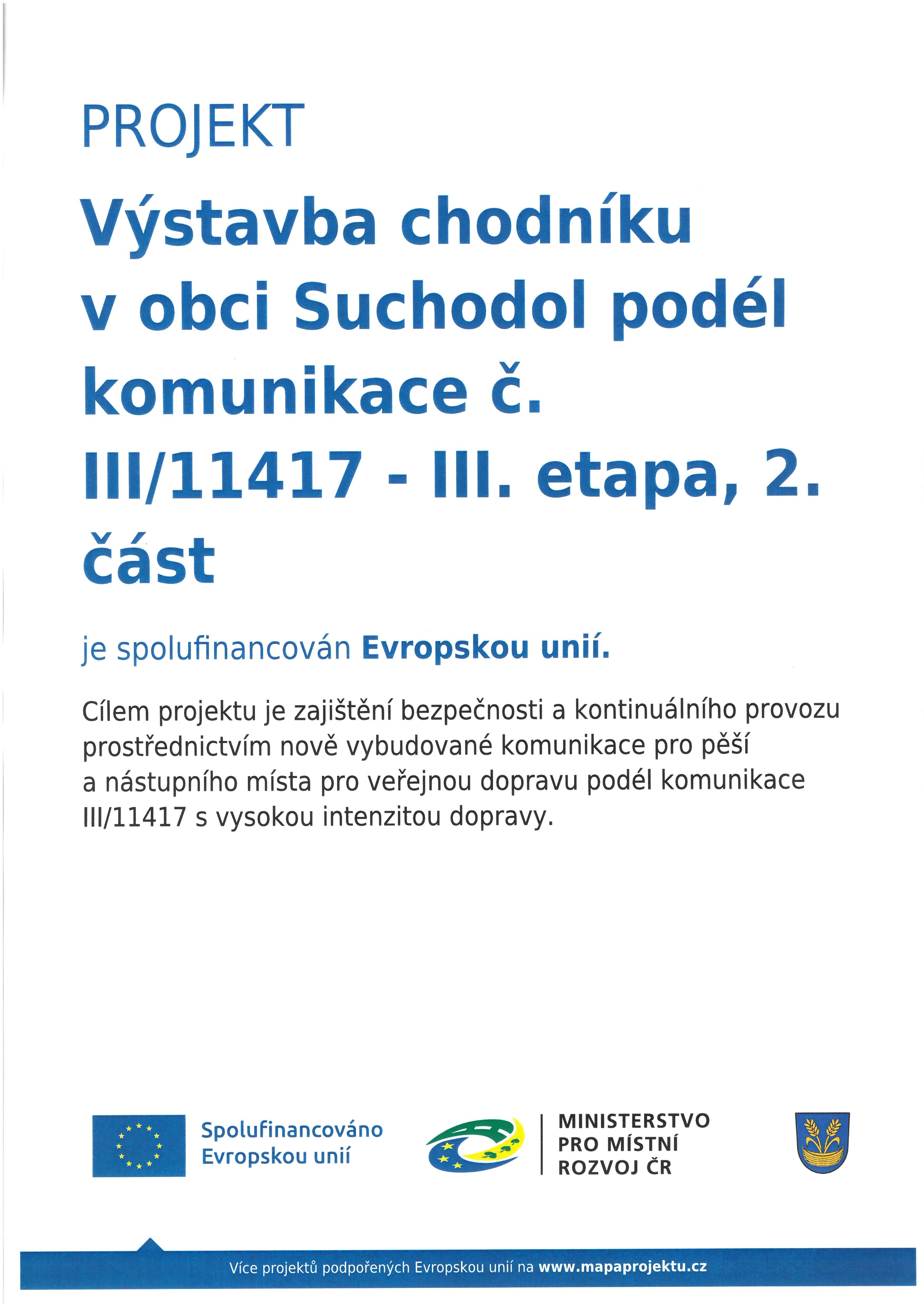 Cílem projektu je zvýšení bezpečnosti chodců a stavba nové komunikace pro chodce. Projekt navazuje na výstavbu chodníků I. etapě, která byla definována jako prvořadá z důvodu zvýšeného výskytu malých dětí v obci, a na II. etapu, ve které se pokračovalo ve výstavě liniové sítě komunikací pro pěší dopravu, pomocí které byl zhotoven chodník v centru obce a v severní části obci s rodinou zástavbou. Cílem III. etapy je pokračování ve zvyšování bezpečnosti v obci Suchodol prostřednictvím vybudování chodníku v jižní části obce. Předmětem žádosti o dotaci je vybudování chodníku od počátku rodinné zástavby v jižní části obce podél komunikace III. třídy č. 11417 až v k první menší návsi ,,u křížku".